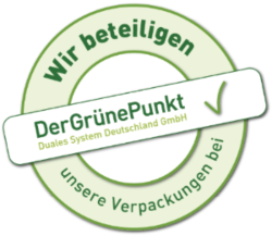 Mit diesem Logo möchten wir zeigen, dass wir Kunde bei Der Grüne Punkt – Duales System Deutschland GmbH sind und unsere Verkaufsverpackungen für Deutschland am dualen System Der Grüne Punkt beteiligen.